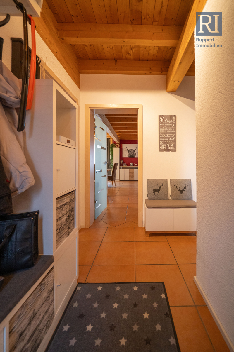 Geradeaus öffnet sich der großzügige Wohn- und Essbereich mit angrenzender, moderner Einbauküche. Der offen gestaltete Grundriss schafft eine helle und einladende Atmosphäre – perfekt für gemeinsame Stunden mit Familie und Freunden. Von hier aus gelangen Sie auf die Terrasse und in den Garten, der mit seiner Größe und Gestaltung vielfältige Möglichkeiten bietet: ob zum Spielen für Kinder, zum Gärtnern für alle mit grünem Daumen oder einfach zum Entspannen an sonnigen Tagen – hier findet jeder seinen Lieblingsplatz im Freien.