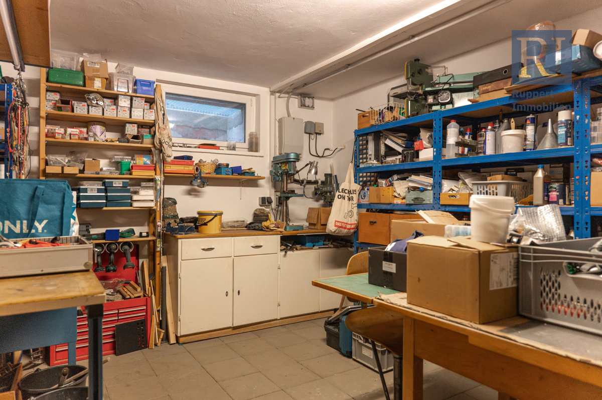 In das Kellergeschoss gelangen Sie durch die Hauptwohnung. Hier erwartet Sie zunächst eine Werkstatt – ein Traum für alle Heimwerker. Nebenan befindet sich ein Partyraum mit Küche und zusätzlichem WC sowie einem separaten Ausgang, der Sie direkt in den Hofraum führt.
