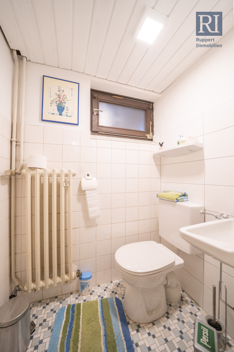 Rechts befinden sich die privaten Räume: ein Schlafzimmer, ein großzügiges Kinderzimmer (ursprünglich zwei Zimmer, teilbar) sowie ein modern saniertes Bad mit Dusche, Wanne, Doppelwaschbecken und WC. Das große Wohn- und Esszimmer mit direktem Gartenzugang sowie die ebenfalls angebundene Küche sorgen für ein offenes Wohngefühl. Ein Gäste-WC ergänzt das Raumangebot.