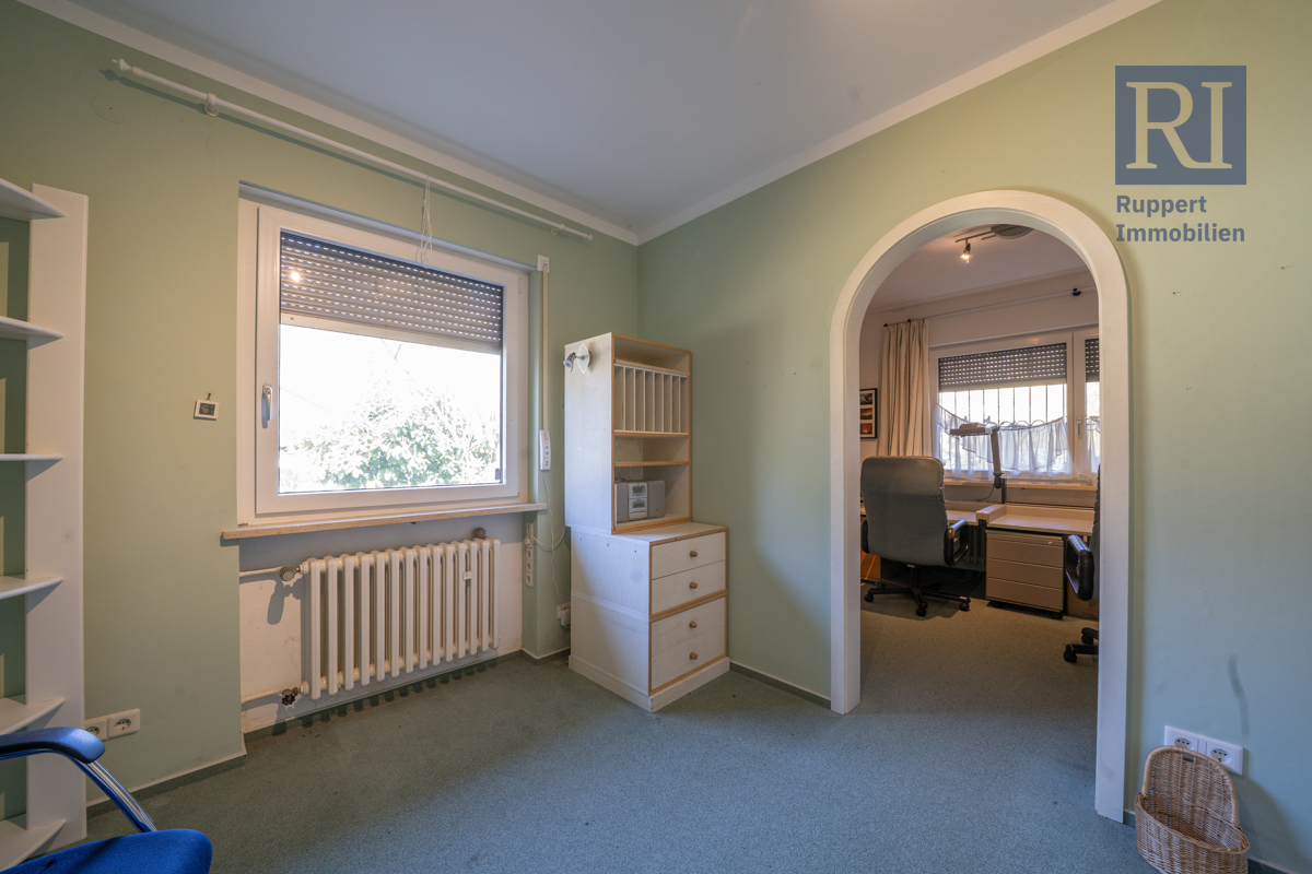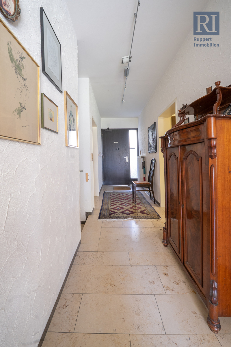 Im Erdgeschoss empfängt Sie ein großzügiger Flur. Links befindet sich ein großes Zimmer mit bereits modernisiertem Bad – ideal als Gäste- oder Schlafzimmer. Geradeaus liegt ein lichtdurchfluteter Raum mit großen Fensterflächen und Blick ins Grüne, der Wintergarten-Charakter hat und durch einen elektrischen Kamin eine gemütliche Atmosphäre schafft.