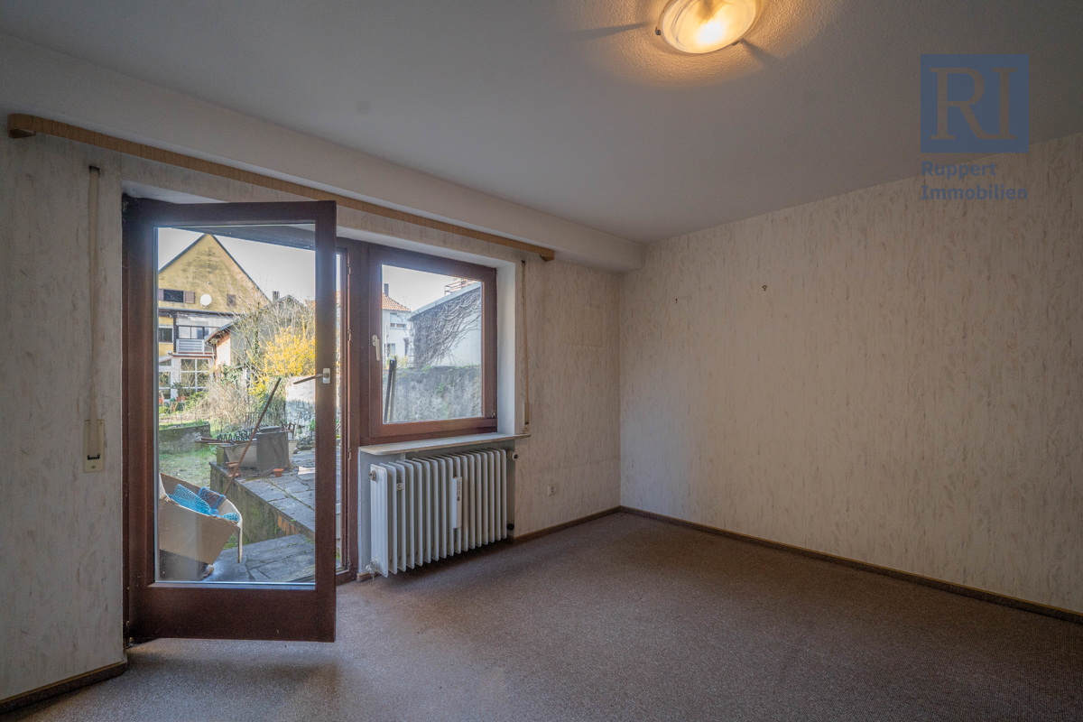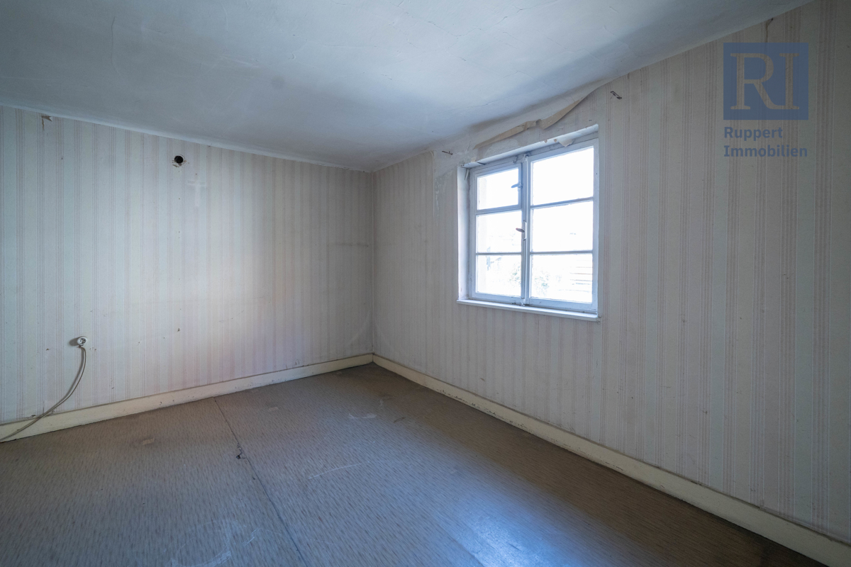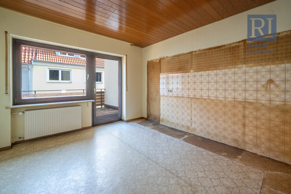 Im Obergeschoss erwartet Sie zunächst die Küche, die genügend Platz für eine Einbauküche nach Ihren persönlichen Vorstellungen bietet. Außerdem befindet sich hier auch der Zugang zum Balkon, der insbesondere in den warmen Sommermonaten zu schönen Stunden im Freien einlädt. Im vorderen Teil der Etage befindet sich auch das Wohnzimmer und das Schlafzimmer sowie das Badezimmer im 70er Jahre Stil. Ein Flur, auf dem sich ein kleiner Abstellraum, eine Garderobe und ein weiteres Gäste-WC befinden, führt Sie in den hinteren Teil des Obergeschosses. Dort erwarten Sie zwei kleinere Zimmer, die jeweils als halbe Zimmer zählen und vielfältig genutzt werden können.