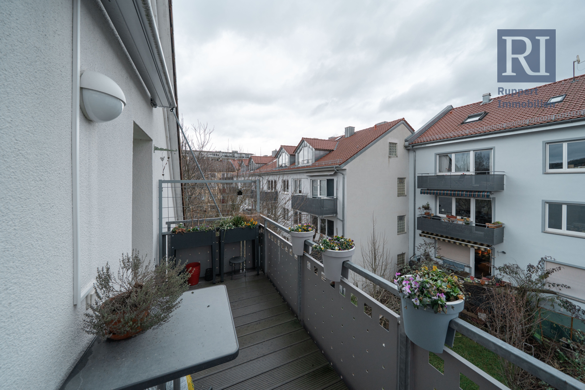 Am Ende des Flurs liegt die gemütliche Wohnküche, die ausreichend Platz für einen Esstisch bietet und mit einer Einbauküche versehen ist. Hier befindet sich auch der Zugang zum süd-östlich ausgerichteten Balkon, der insbesondere in den warmen Sommermonaten gut genutzt werden kann. Nebenan erwartet Sie das Wohnzimmer, das ebenfalls über einen Zugang zum Balkon verfügt. Zu guter Letzt wird die Wohnung durch das geräumige Schlafzimmer vervollständigt.